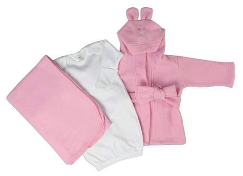 White Infant Gown (100% Cotton), Pink Fleece Robe With Hoodie (Polyester), Pink Polarfleece Blanket (100% Cotton)